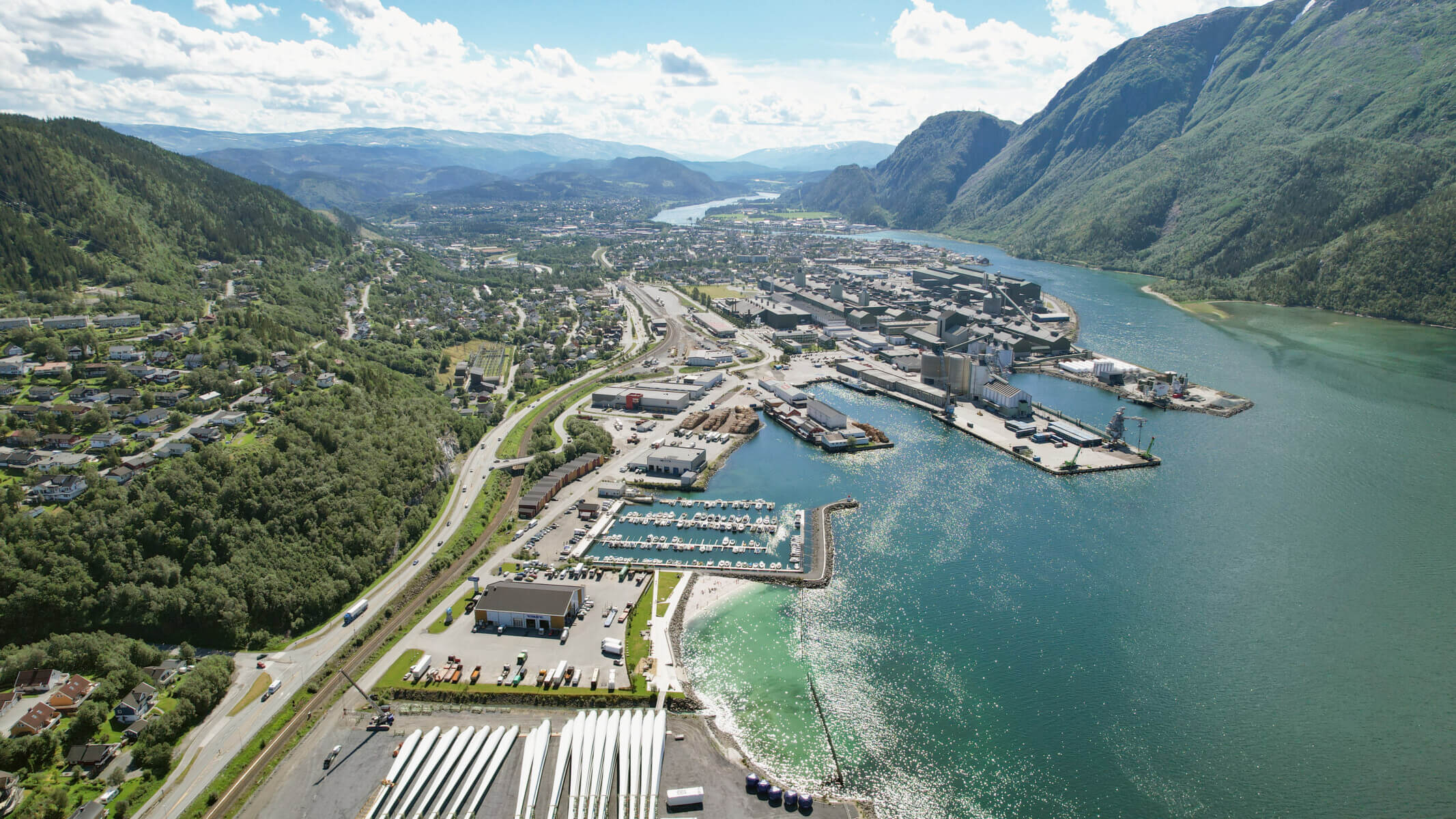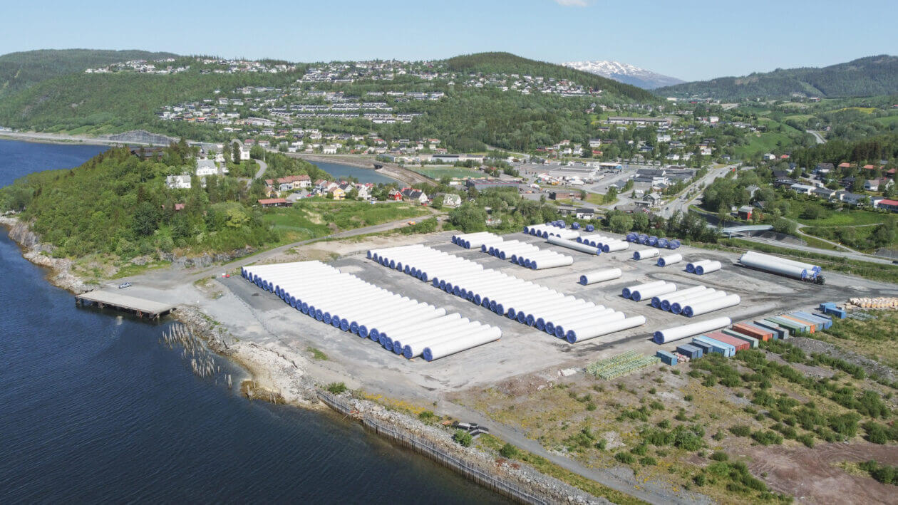 Bird’s-eye view of wind turbine components at the storage area at the Port of Mosjøen