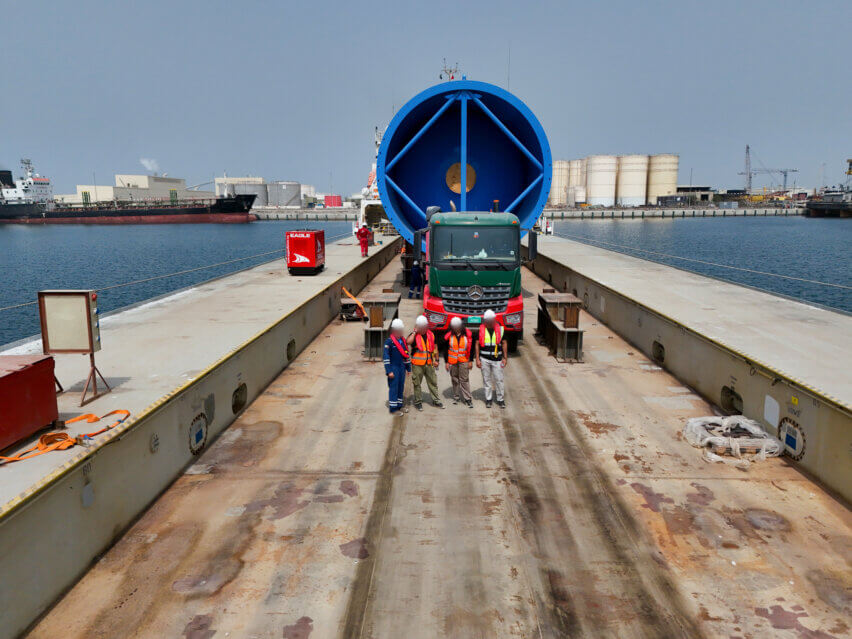 The deaerator vessels were collected from the supplier’s facility in Ras Al Khaimah. Using a gantry crane, they were loaded onto two 12-axle-line conventional trailers, which were arranged for by deugro. After successfully loading and securing the cargo in accordance with the method statements, which were drawn up by dteq, the vessels were transported over a 600-meter route to the RMC jetty at an average speed of approximately 5 km/h. For this purpose, deugro coordinated traffic management and secured all necessary road and port permits.